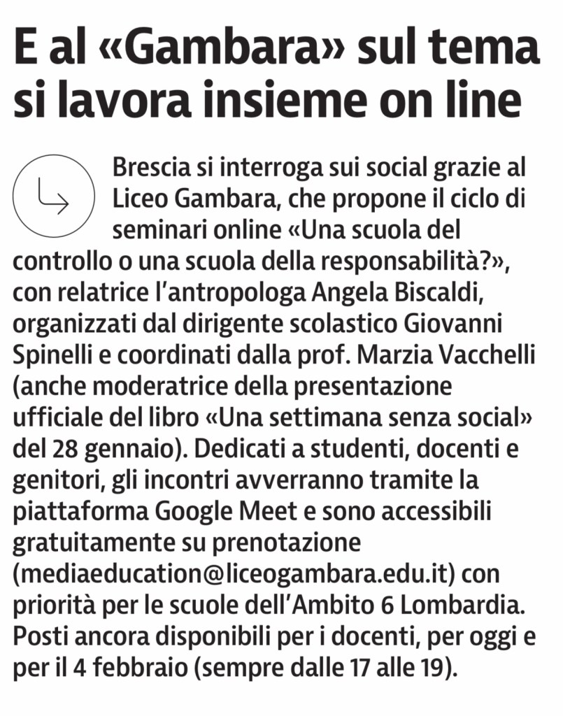 Dal Giornale di Brescia 22.01.2021 „Una scuola del controllo o una scuola della responsabilità?“: oggi alle 17:00 in Meet Liceo Gambara