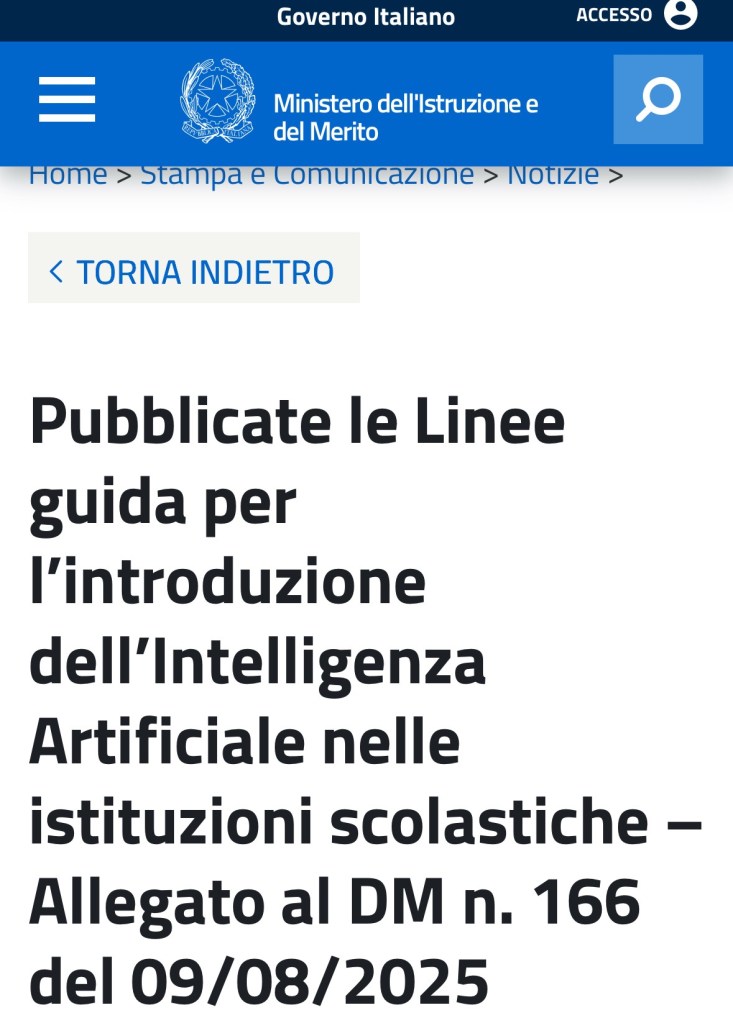In attesa della registrazione, da parte degli organi di controllo, del Decreto Ministeriale n. 166 del 9 agosto 2025 che ha ricevuto parere favorevole del Garante della Privacy, il Ministero dell’Istruzione e del Merito rende disponibili le Linee guida per l’introduzione dell’Intelligenza Artificiale nelle istituzioni scolastiche, allegate al provvedimento.