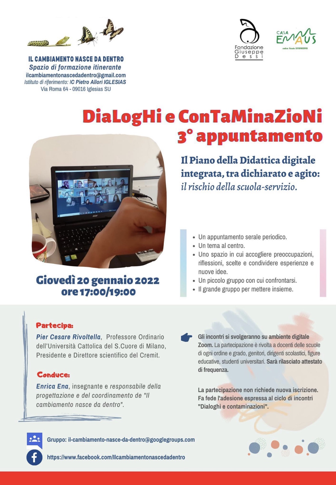Interverrà il Prof. Pier Cesare Rivoltella, Professore Ordinario dell’Università Cattolica del Sacro Cuore di Milano e Presidente del Cremit, mentre la conduzione sarà affidata a Enrica Ena, coordinatrice e responsabile della progettazione de “Il cambiamento nasce da dentro”.